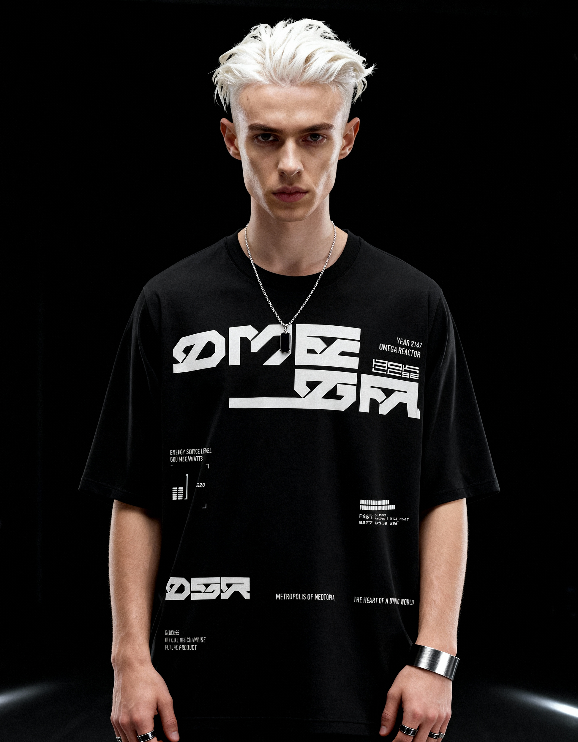 The front chest features a OMEGA in a futuristic font — a cryptic emblem of rebellion, hinting at lost codes and hidden messages. The back print unfolds into a dystopian data stream, layered with fractured grids, digital hieroglyphs, and glitch typography—a tribute to hackers, breakers, and those who challenge the system.